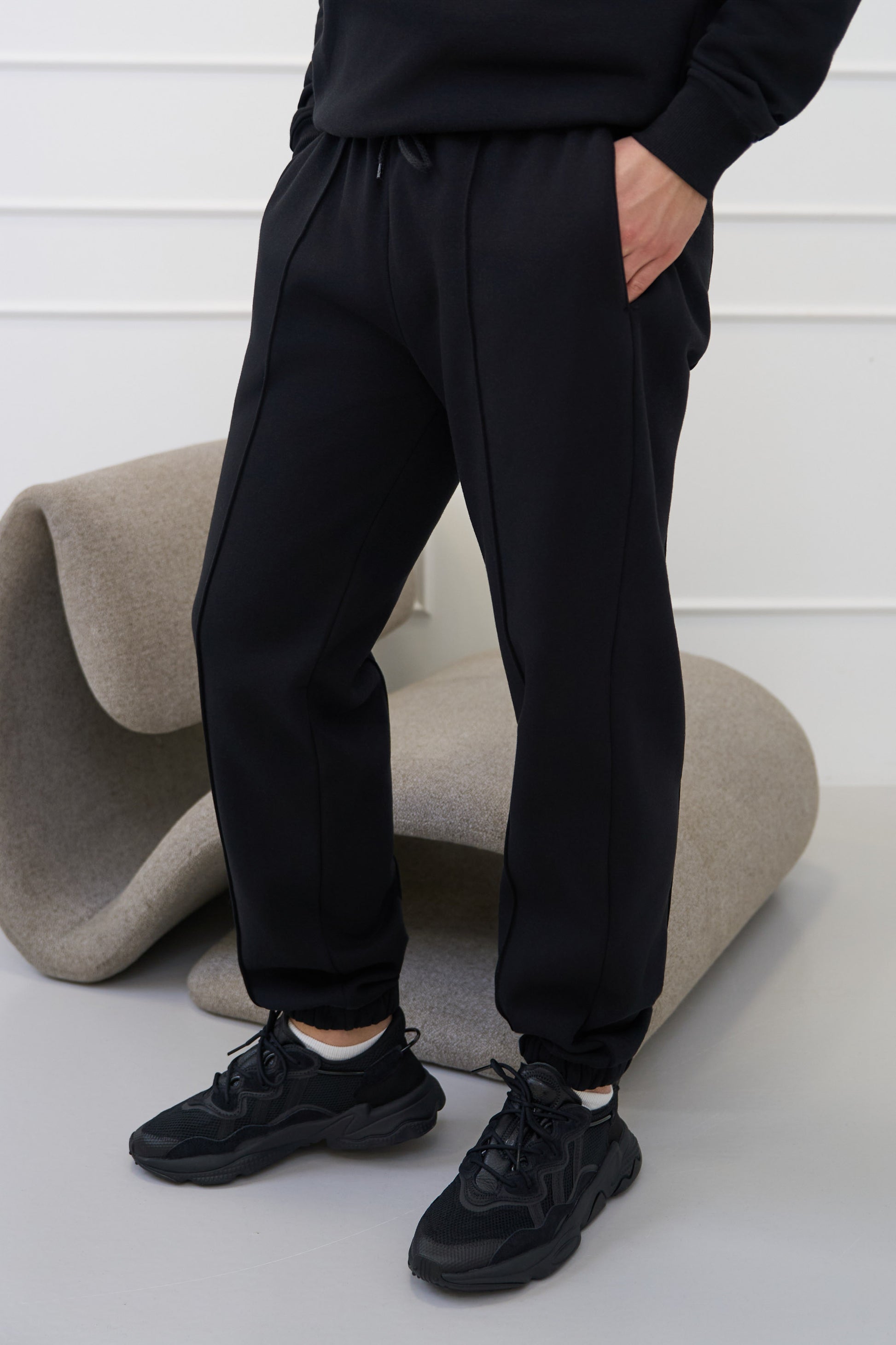 Priekinėje kelnių dalyje esanti išilginė dekoratyvinė siūlė suteikia drabužiui struktūros ir vizualiai pailgina siluetą, suteikdama laisvalaikio aprangai daugiau solidumo.