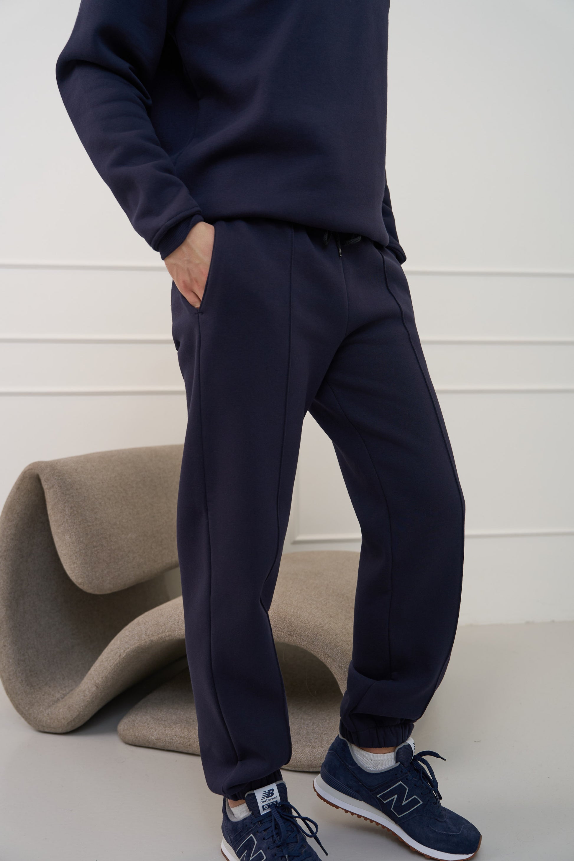 Navy blue spalvos vyriškos plačios kelnės su kantu