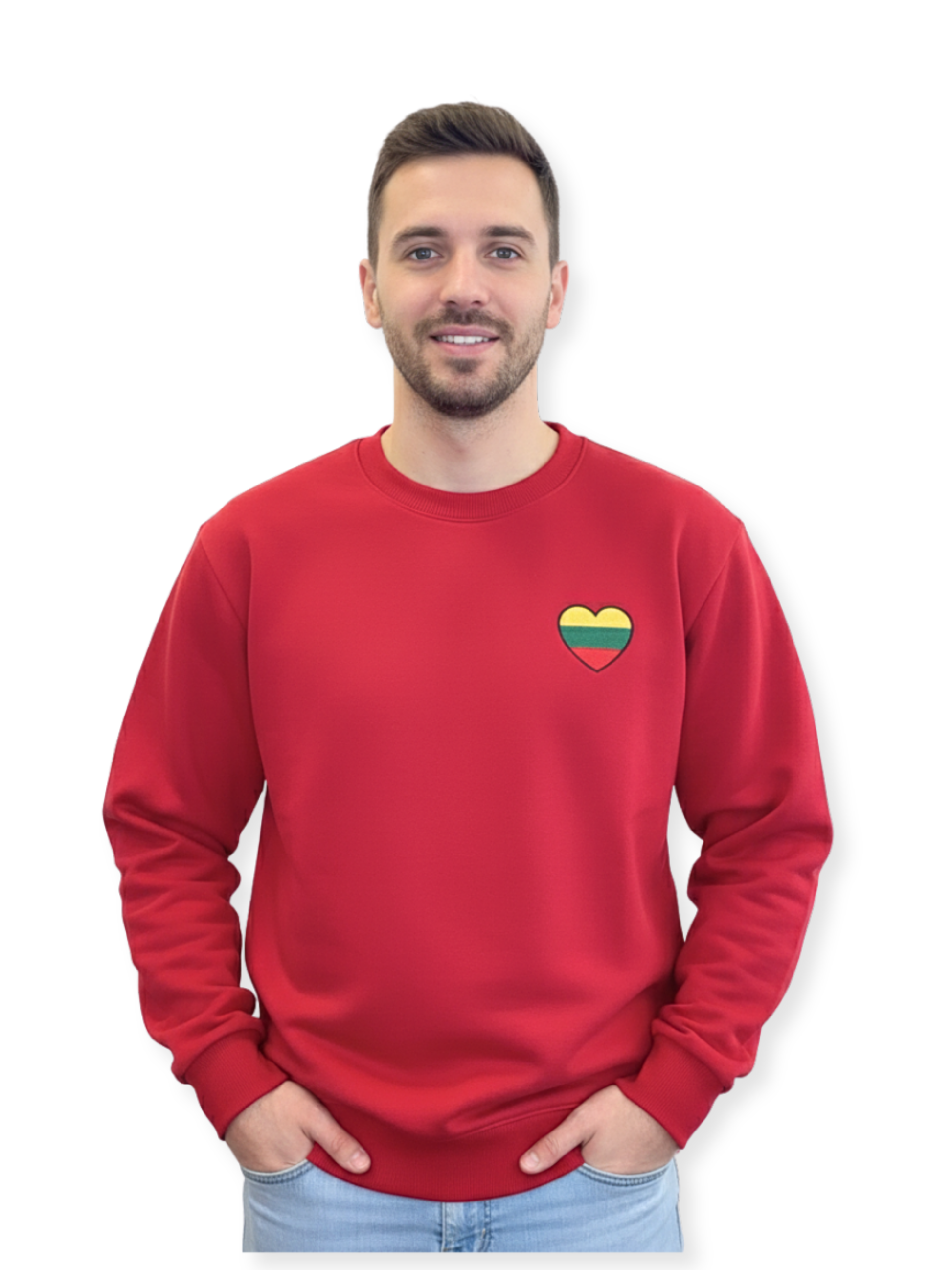 Raudonas džemperis su Lietuvos trispalve