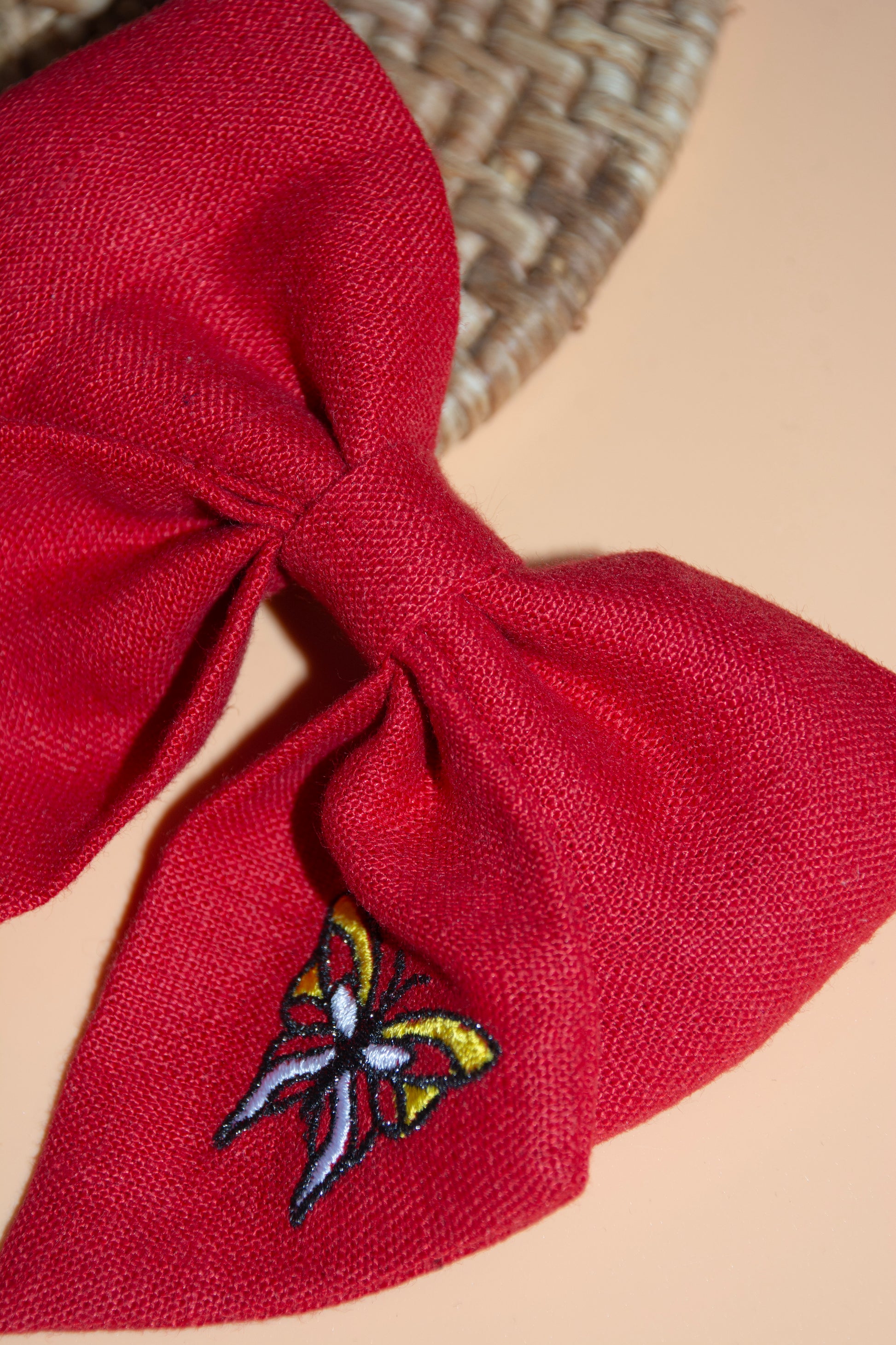 Raudonos spalvos didelis lininis kaspinas plaukams
