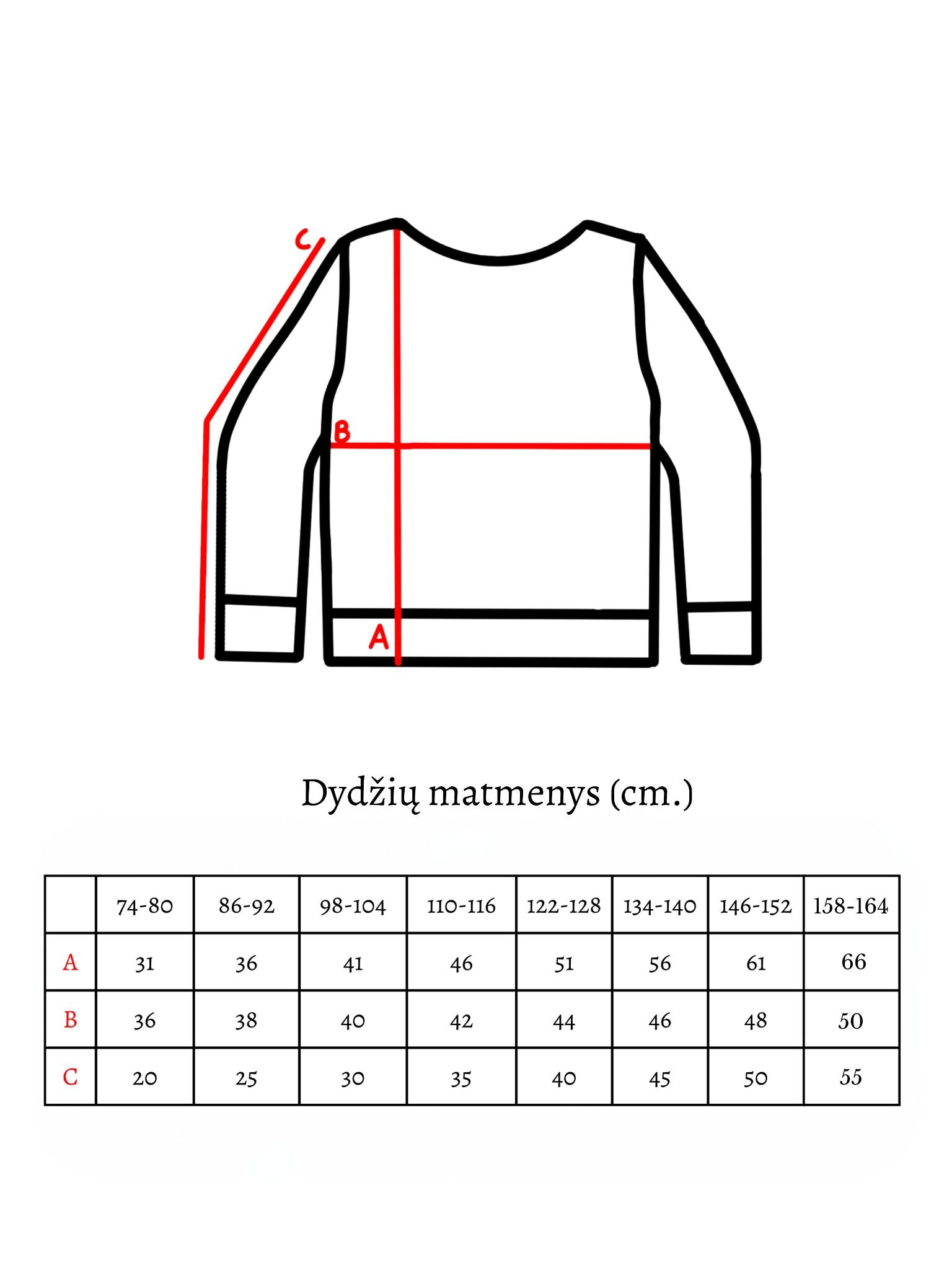 Išmatavimus rasite nuotraukų galerijoje. Gali būti +-1 cm paklaida, nes drabužiai rankų darbo.